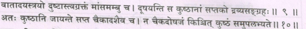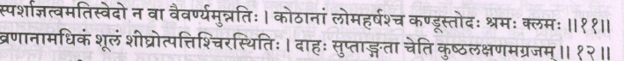 Meaning: According to this shloka, insensitivity to touch, profuse sweating or no sweating at all, loss of natural complexion of skin, urticaria, itching, prickling pain, tiredness, senses are unable to perform their functions, wounds that have severe pain, easy wounding, wounds that do not heal early, burning sensation and numbness in the organs – all these are the symptoms of skin disorders.